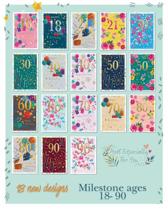 They are also adding 18 new designs to their 'Most Especially For You' - Milestone Ages range. These eye-catching, colourful cards cover ages 18 - 90 and feature beautiful emboss details, striking foiling and happy, celebratory designs. All code 75/JJ. Click here to see a preview.