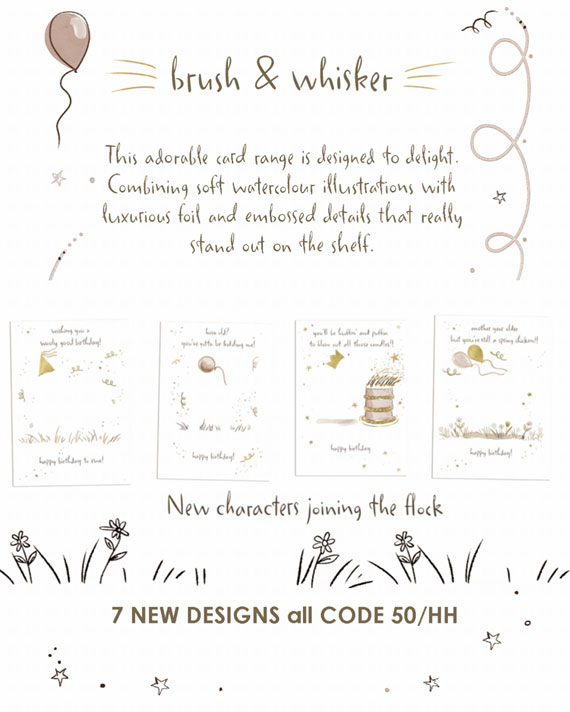 International Cards & Gifts are releasing seven cute new illustrations to add to their delightful 'Brush and Whisker' range. The collection, combining soft watercolours with luxurious foil and emboss finishes, is sure to stand out on the shelf. All code 50HH.